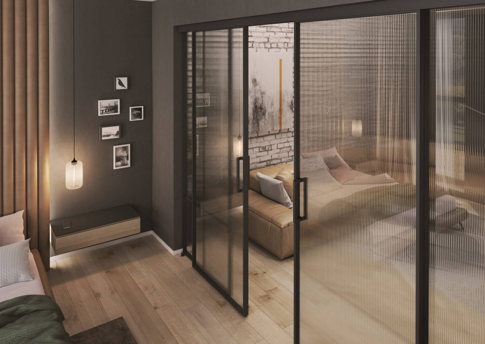 Aluminiowe drzwi przesuwne pojedyncze lub podwójne, wypełnione szkłem lub płytą, w połączeniu ze stałymi panelami bocznymi w różnych konfiguracjach, nadają pomieszczeniu industrialny charakter. Szerokość nie może przekraczać 1 m dla panelu stałego i 1,5 m dla drzwi przesuwnych. Podziały poziome i pionowe można wykonać w dowolnym układzie dla obu. Do drzwi została zaprojektowana specjalna klamka dostępna w trzech długościach.